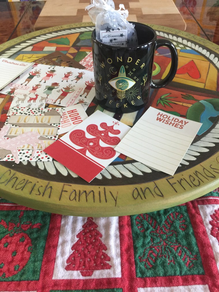 Arriving just yesterday, a package from friend Kathy; I open this morning and am greeted with a delightful mug and all sorts of Christmas/Holiday themed paraphernalia to include in my Christmas album/journal. I squeal -only to my ears – with delight!