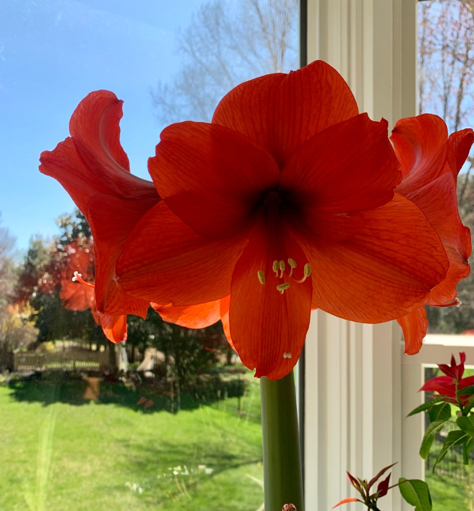 3.26, was Friendstitch Sunday … the six of us always, always look forward to these monthly gatherings, now in the 9th year. This past Sunday, we met at Michelle’s and were greeted with gorgeous spring flowers: daffodils and amaryllis. For Christmas 2019, I gave Michelle (and the others, each) a bulb… Michelle has the magic green thumb. We were delighted to see the amaryllis in full bloom. In addition to being treated to a spectacularly colorful array of flowers, we had an absolutely delicious meal. Yum! The memory of Sunday makes me happier…